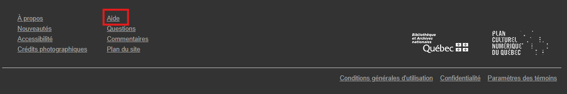 Dans BAnQ numérique, l’aide se situe dans le pied de page, en bas à gauche.