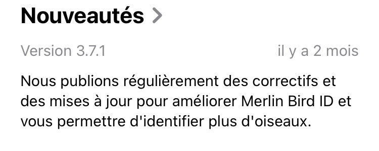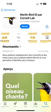 Voici les différentes informations à vérifier, avec l’exemple de l’application d’ornithologie Merlin Bird ID par Cornell Lab.