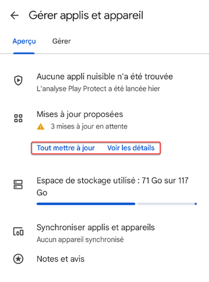 4. Sous Mises à jour proposées, cliquez sur Tout mettre à jour ou cliquez sur Voir les détails pour mettre à jour des applications en particulier.