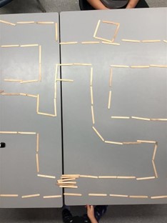 - Demandez-leur de s’installer autour du point de rassemblement (tapis). Au centre du tapis, commencez à construire des routes à l’aide de bâtonnets à café afin de créer une ville. Les enfants peuvent ensuite faire la même chose sur leurs tables, en équipes.