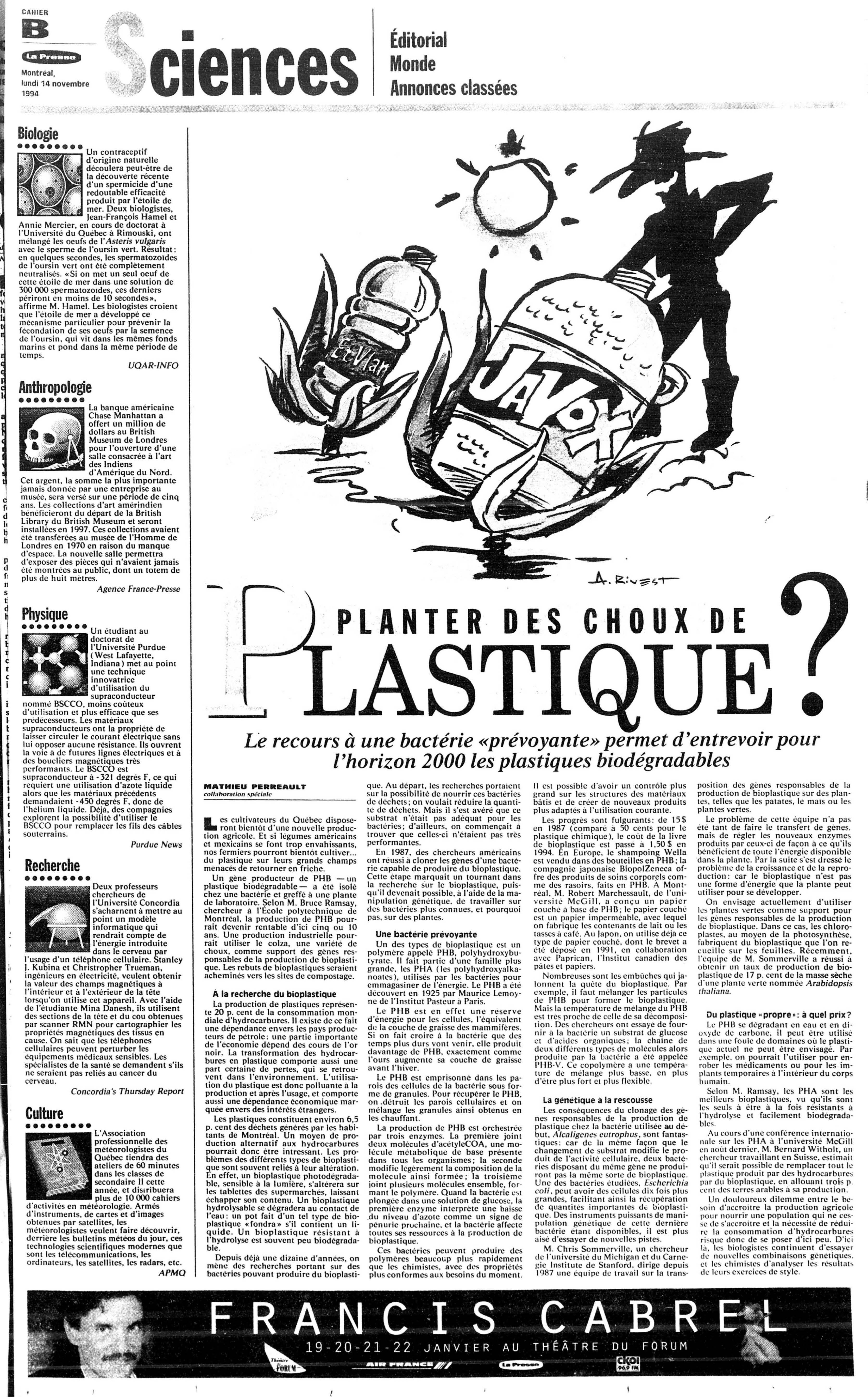 1. Mathieu Perreault, « Planter des choux de plastique? », La Presse, 14 novembre 1994, cahier B, p. 1.