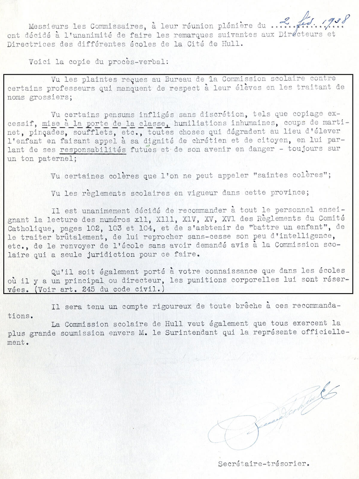[Lettre aux commissaires], 2 février 1938. Archives nationales à Gatineau, fonds Hector Legros (P7, S2, SS2, SSS2, D5, P10).
