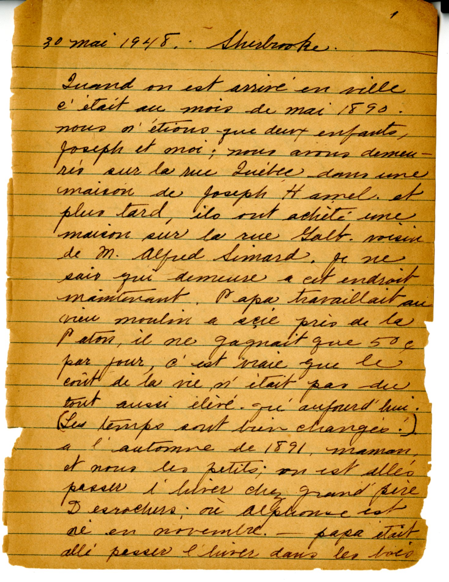 « À partir de la rue Québec qui était la dernière, c’était des pacages et du bois tout le long de la rue King, qui était le vieux chemin de Montréal. Il était à peu près impassable. La voiture allait sur tous les côtés. Maman tenait Alphonse dans ses bras. Moi j’étais assise au milieu. Le vieux Therrien débarquait souvent pour tenir les roues, afin que nous ne tombions pas dans le chemin. Il tirait sur ses guides et disait ‘’Who Blond, doucement’’[2]. »