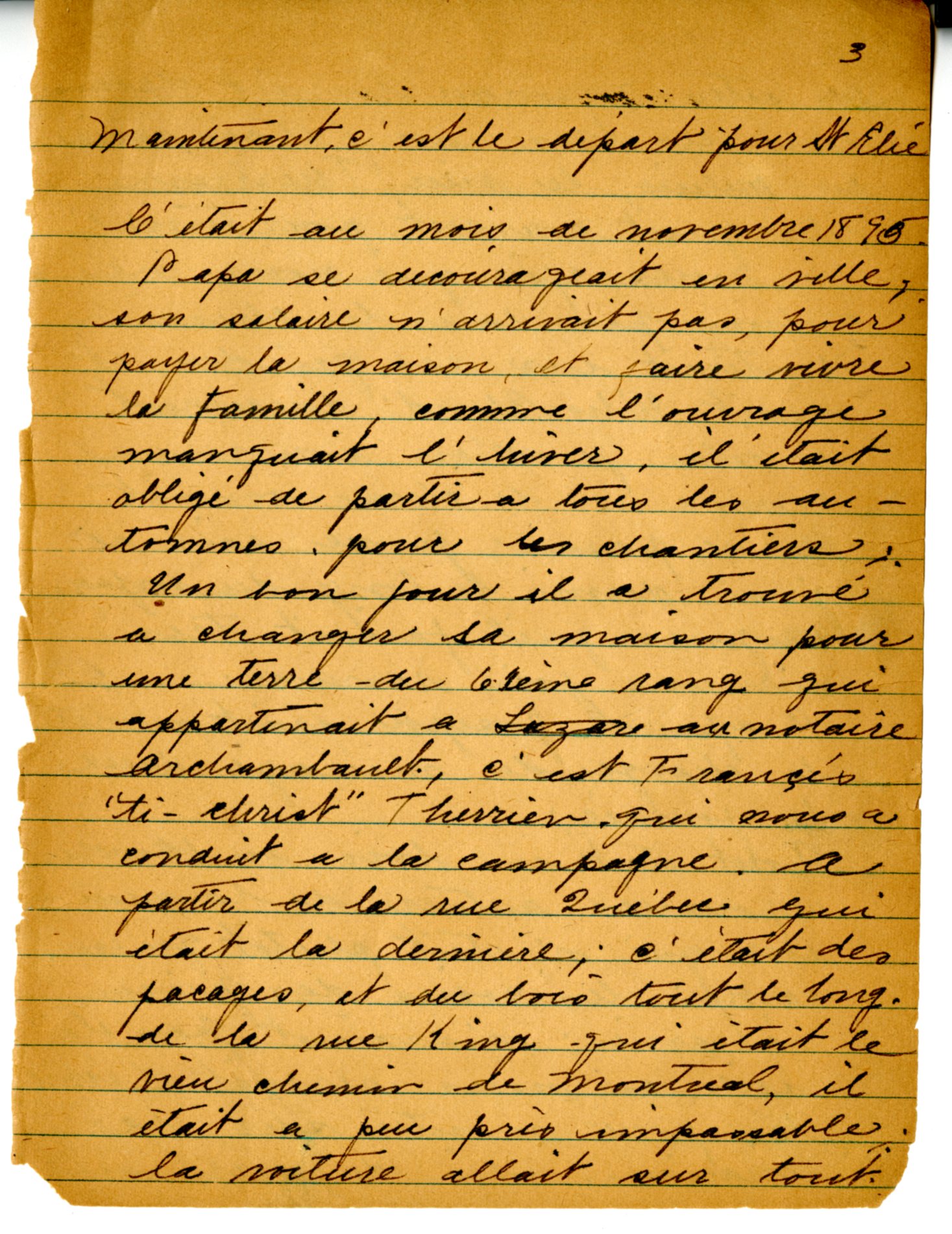 « On revoyait notre père quand il tournait la croisée du chemin, avec son sac sur le dos, pour prendre les raccourcis à travers les bois, pour s’en aller passer l’hiver au loin. On pleurait de voir pleurer maman qui nous disait qu’il partait pour longtemps[4]. »
