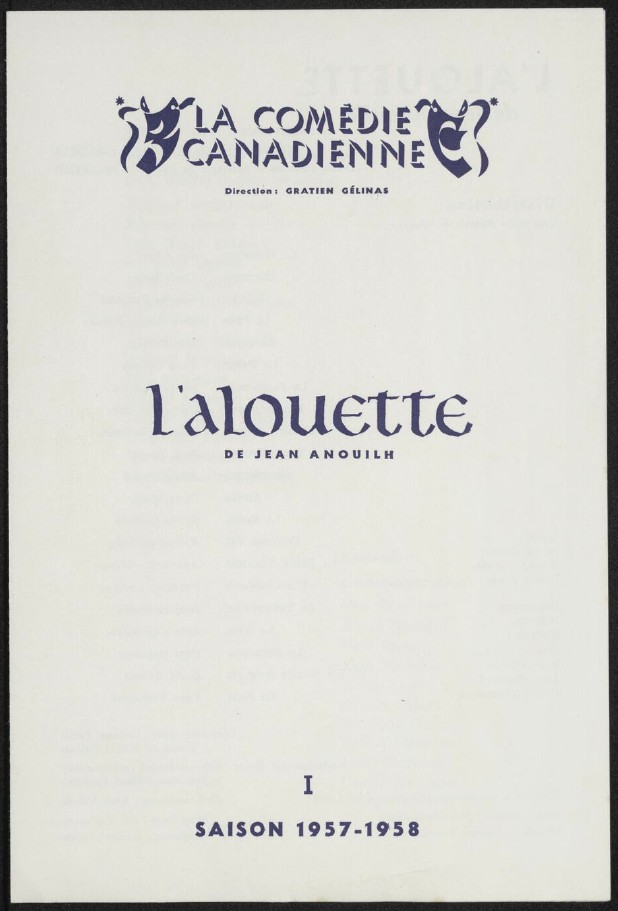 C'est L’alouette, pièce de Jean Anouilh, qui inaugure la première saison de la Comédie-Canadienne, dans une mise en scène de Gratien Gélinas lui-même. Le court programme de la soirée, tout en sobriété, aligne les noms de comédiens biens connus à l’époque ou appelés à le devenir, parmi lesquels Robert Gadouas, Jacques Godin, Dyne Mousso et Gilles Pelletier.