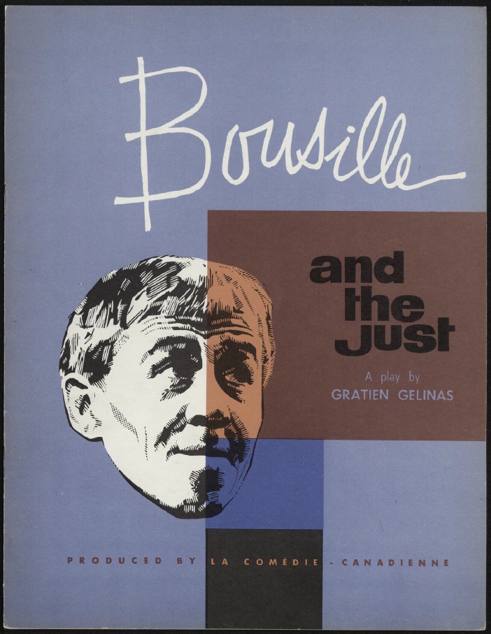 Enfin, un jeune Guy Lalumière participe à l’aventure de la Comédie-Canadienne en créant les élégantes lignes graphiques du programme de la représentation anglaise de Bousille et les justes. Diplômé en 1953 de l’École des beaux-arts de Montréal, ce jeune artiste fondera l’année suivante le studio Guy Lalumière, qui offrira des créations en communication visuelle, en graphisme et en photographie jusqu’au début des années 1980.