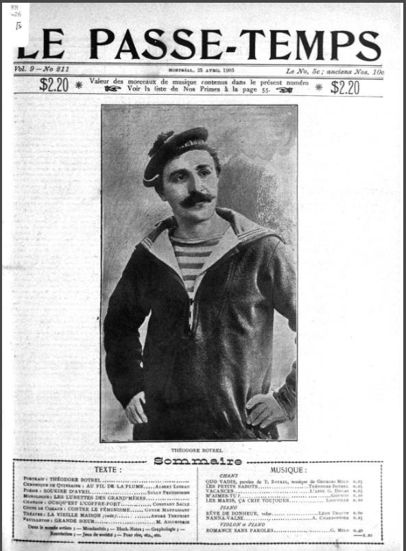 Des publications de Botrel contribuent à le faire connaître chez nous : l’anthologie des Chansons de Botrel, publiée par la Librairie Beauchemin à Montréal en 1904, a fait l’objet de nombreuses éditions. Botrel assume également pendant plusieurs années la direction artistique de la revue La Bonne Chanson, revue du foyer littéraire et musicale[5]. Les valeurs véhiculées dans ces chansons ont tout pour séduire l’élite religieuse et politique de l’époque : l’attachement au terroir et au régionalisme, la morale chrétienne, le patriotisme et une transmission de la mémoire collective.