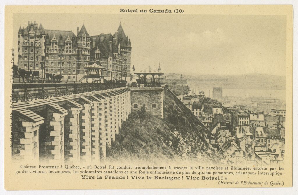 Après le succès retentissant de sa tournée de 1903, il repart vers sa terre natale avec une somme importante issue de la vente des billets. Botrel a d’ores et déjà une idée précise de ce qu’il veut faire avec cet argent : ériger une statue de l’explorateur Jacques Cartier à Saint-Malo[3]. Une autre source de financement pour ce projet est la création d’une série de 12 cartes postales intitulées « Botrel au Canada »[4]. Celles-ci représentent quelques clichés et mises en scène de l’Amérique du Nord vus à travers la lentille d’un voyageur français.