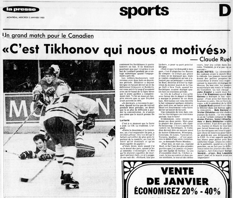 Mais une déclaration de l’entraîneur soviétique Viktor Tikhonov fouette la troupe tricolore : « Il ne sait pas ce qu'il a fait à tout le monde quand il a dit, hier, que le match contre le Canadien était le plus important pour eux », confie le coach du CH, Claude Ruel (La Presse, 2 janvier 1980).