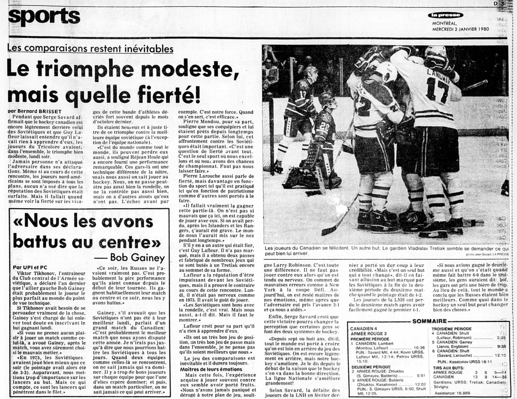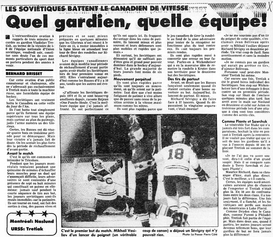 « Les Soviétiques ont vraiment battu le Canadien en cette veille du jour de l’An. Ils l’ont battu tout simplement parce qu'ils forment une équipe supérieure sur tous les plans, mais surtout au plan du patinage, jadis l'arme numéro un des Glorieux. Certes, les Russes ont dû réussir quatre buts en troisième période pour se démarquer. Mais leur victoire n'a jamais fait de doute. On les sentait les plus forts dès la période de réchauffement d’avant-partie », rapporte Bernard Brisset (La Presse du 3 janvier 1983).