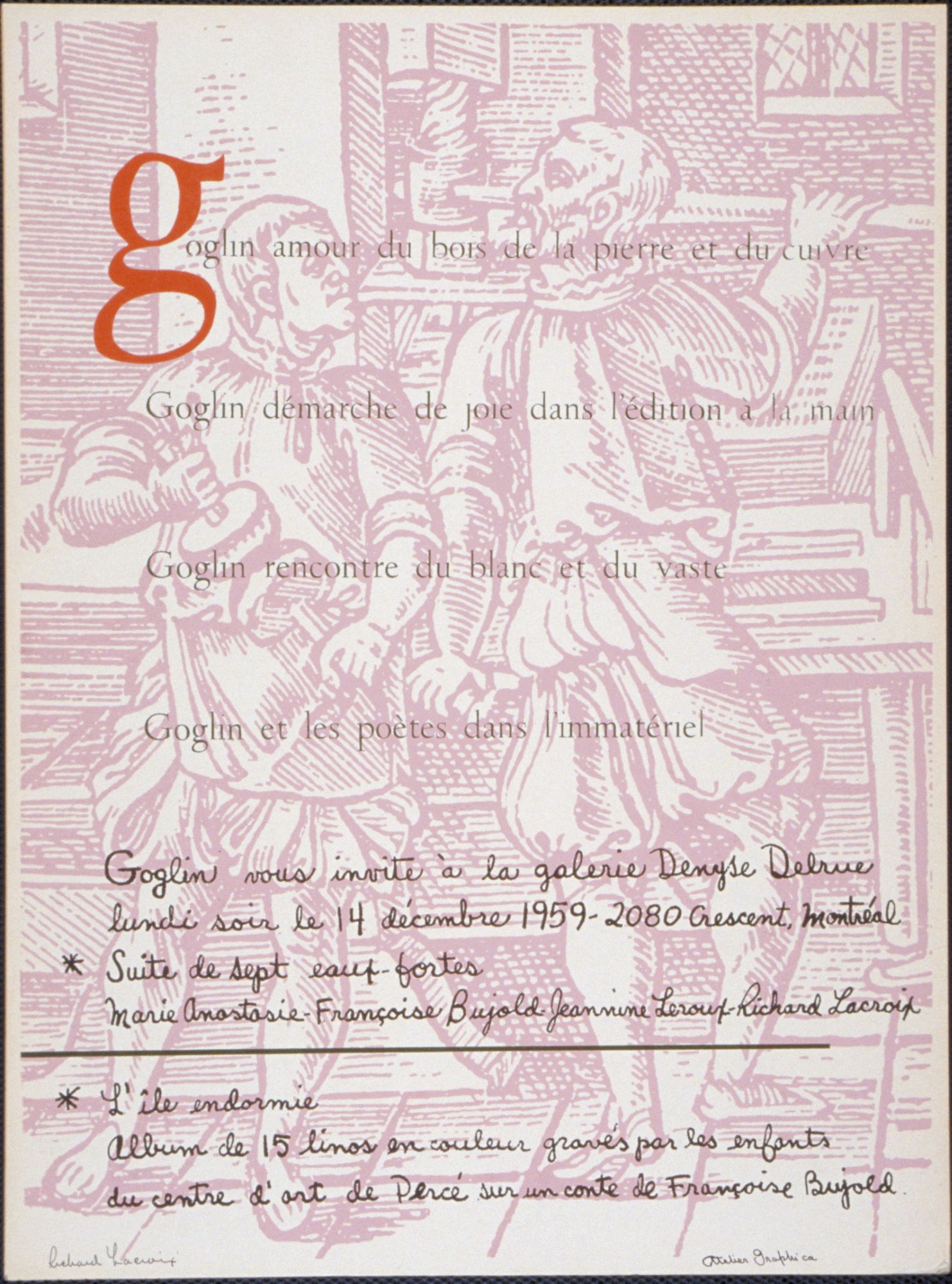 Situées entre Refus global et la Révolution tranquille, les années 1950 constituent un moment méconnu de diversification des pratiques culturelles et de développement artistique au Québec. Non-intervention de l’État en culture, fermeture de l’essentiel des maisons d’édition fondées pendant la Seconde Guerre mondiale et baisse globale de la production de livres forment un contexte propice à l’artisanat et à l’édition expérimentale[note 1]. Sous l’impulsion de maîtres artisans comme Albert Dumouchel et Arthur Gladu, une vision novatrice de la poésie s’affirme en atelier, inscrivant le vers en continuité avec la typographie, l’iconographie et le livre en tant qu’objet d’art. Vécue sur un mode clandestin, cette poésie acquiert une importance renouvelée puisqu’elle relève d’un espace concret de socialisation où les artistes peuvent donner forme à des projets éminemment personnels.