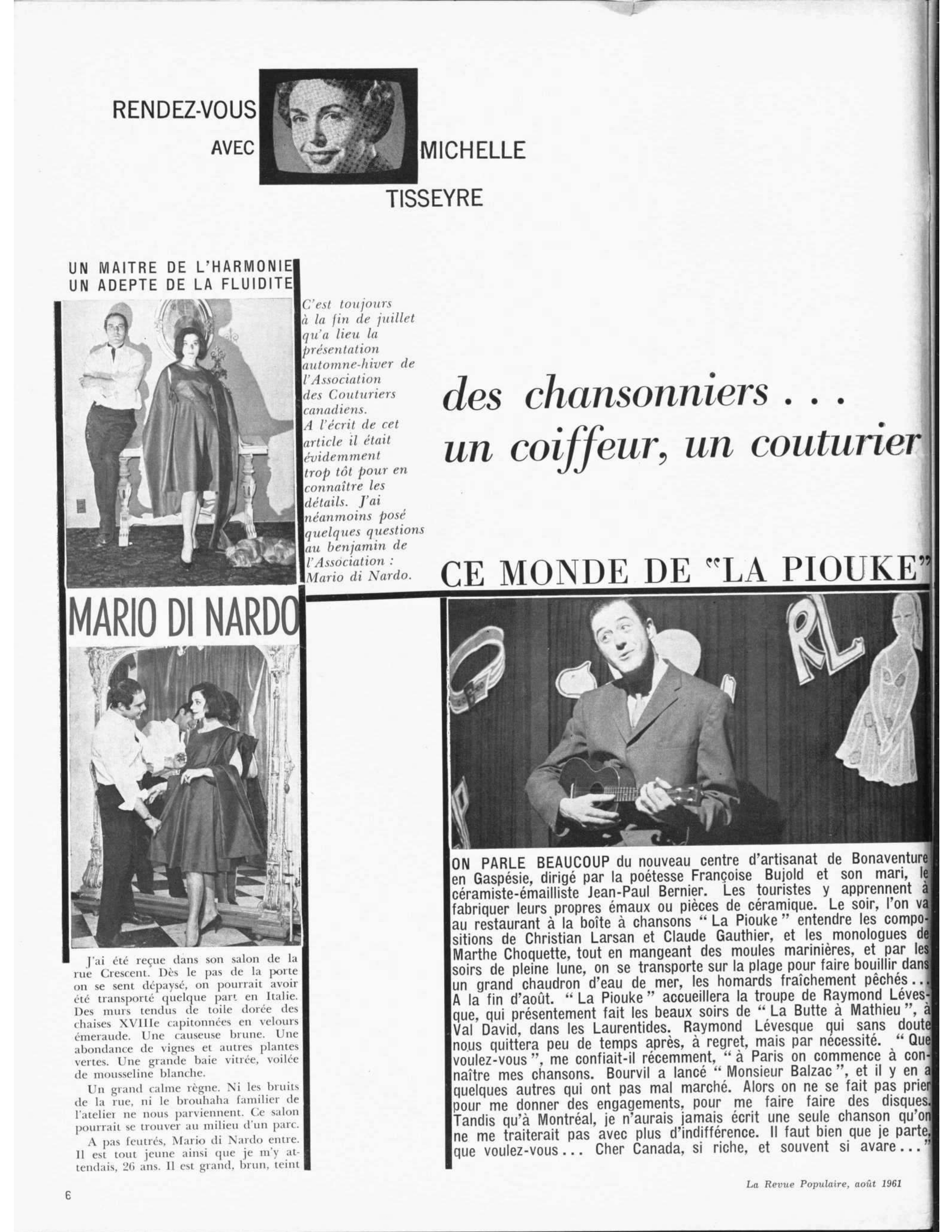[Note 5] Pierre Luc, « À ‘‘La Piouke’’ : Des chansonniers dans l’antre d’une sorcière », La Patrie du dimanche, 25 juin 1961, Édition 1, p. 19.