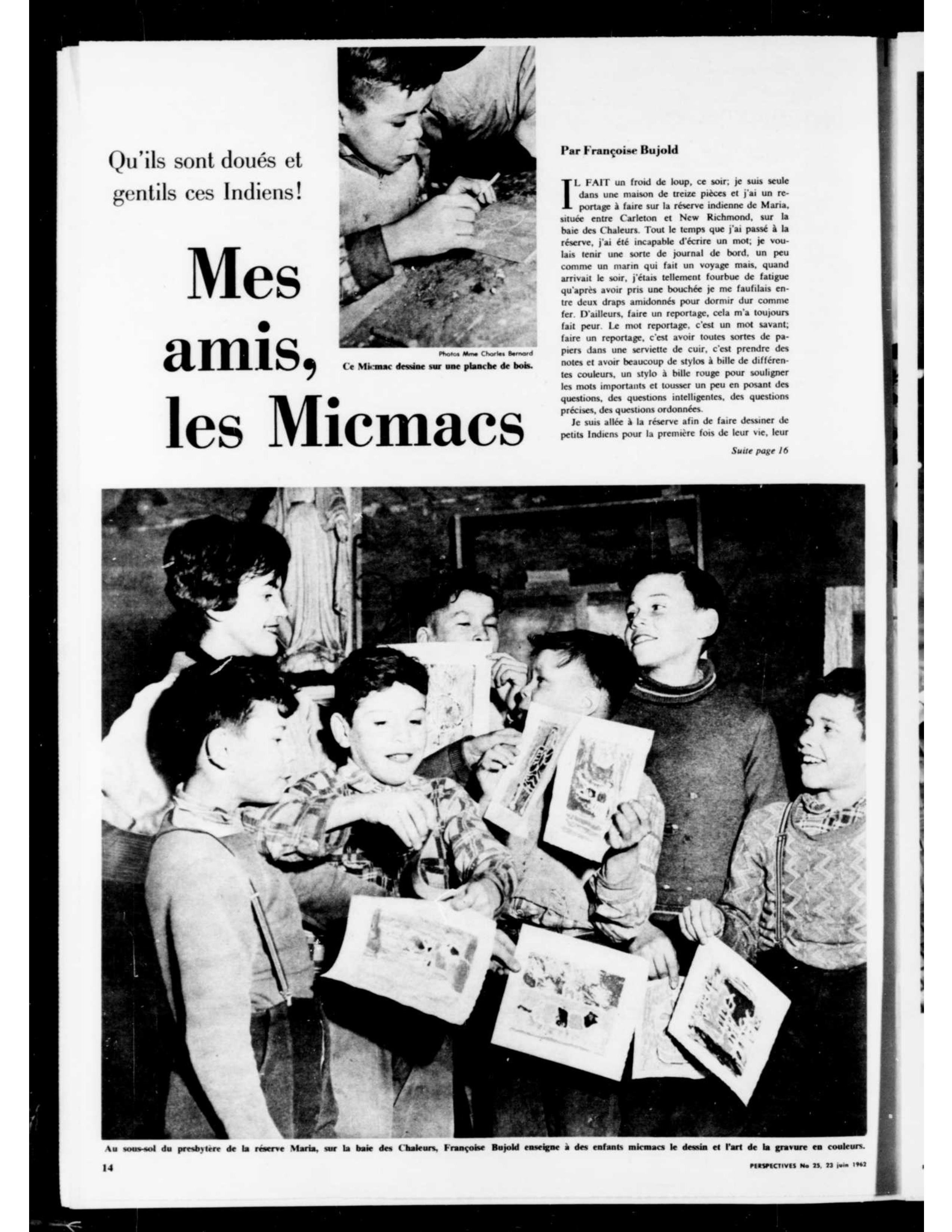 La couleur, la peinture et le bois deviennent le langage par lequel les enfants font découvrir à la poétesse une mythologie bien à eux et, de ce fait, la conscientisent à leurs problèmes d’isolement. Ce n’est qu’en se débarrassant de la lorgnette de savante et en nivelant tout rapport d’autorité que Bujold peut écrire à partir des gravures. En résultent deux autres livres chez Sentinelle : Une fleur debout dans un canot (1962) et La naissance du soleil (1966). Ses séjours à Maria ont aussi mené à la création d’un court métrage produit par l’Office national du film aux côtés de Jacques Brault, intitulé Le monde va nous prendre pour des sauvages, qui brosse le portrait d’enfants micmacs méfiants à l’idée de dévoiler à la caméra le secret de leurs jeux de plage.