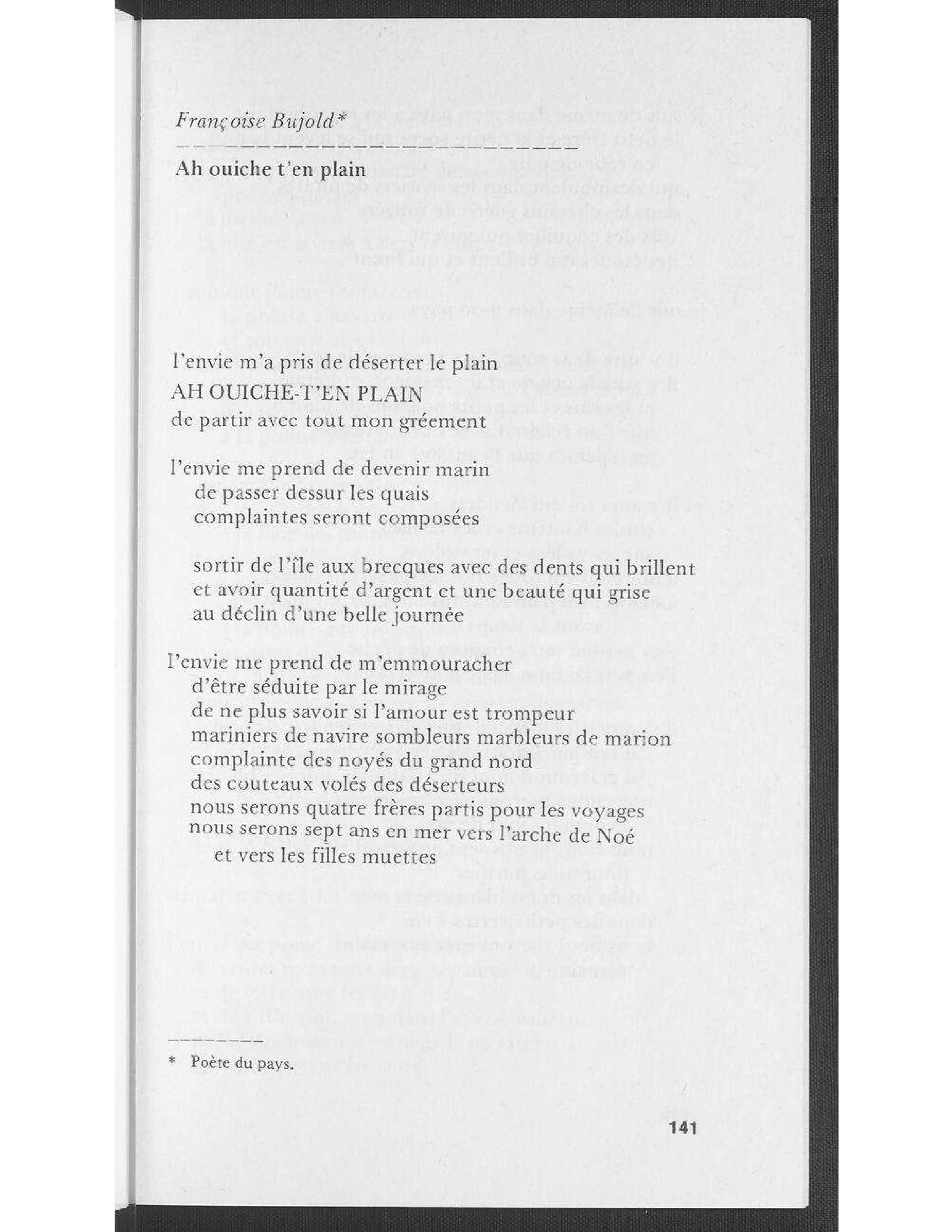 L’angoisse chez Bujold est un gage d’humanité, de liaison fondamentale au vivant et à la possibilité de se métamorphoser avec lui. De cette posture germe une image inhabituelle de la Gaspésie, dont le long poème Ah! Ouiche t’en plain! est sans doute le plus emblématique pour exprimer la crainte de l’inertie et la promesse du mouvement pour celles et ceux qui sont nés au bord de l’eau.