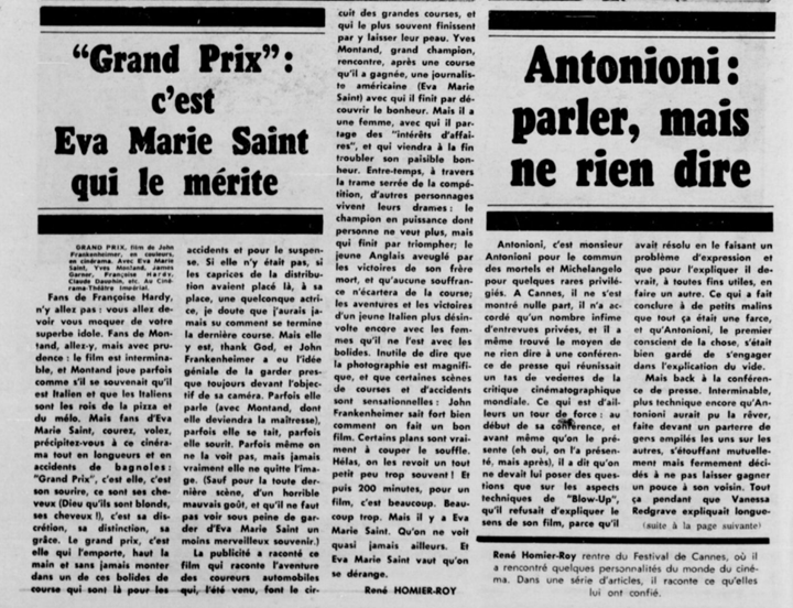 Dépêché au Festival de Cannes en 1967, il rend compte du film de course automobile Grand Prix, dans lequel joue, entre autres, Yves Montand : « Fans de Montand, allez-y, mais avec prudence : le film est interminable, et Montand joue parfois comme s’il se souvenait qu’il est italien et que les ltaliens sont les rois de la pizza et du mélo ». Son compte rendu d’une conférence de presse du cinéaste Michelangelo Antonioni est aussi plutôt « distrayant » (Le Petit Journal, 11 juin 1967).