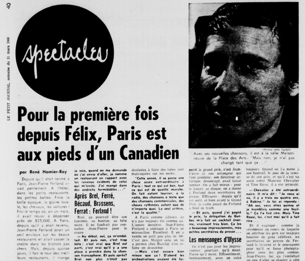 L’année suivante, il s’entretient avec un Jean-Pierre Ferland reparti à la conquête de Paris (Le Petit Journal, 31 mars 1968) avec en poche un Grand Prix du disque de l’Académie Charles-Cros. « Pour la première fois depuis Félix, Paris est aux pieds d'un Canadien », écrit Homier-Roy.