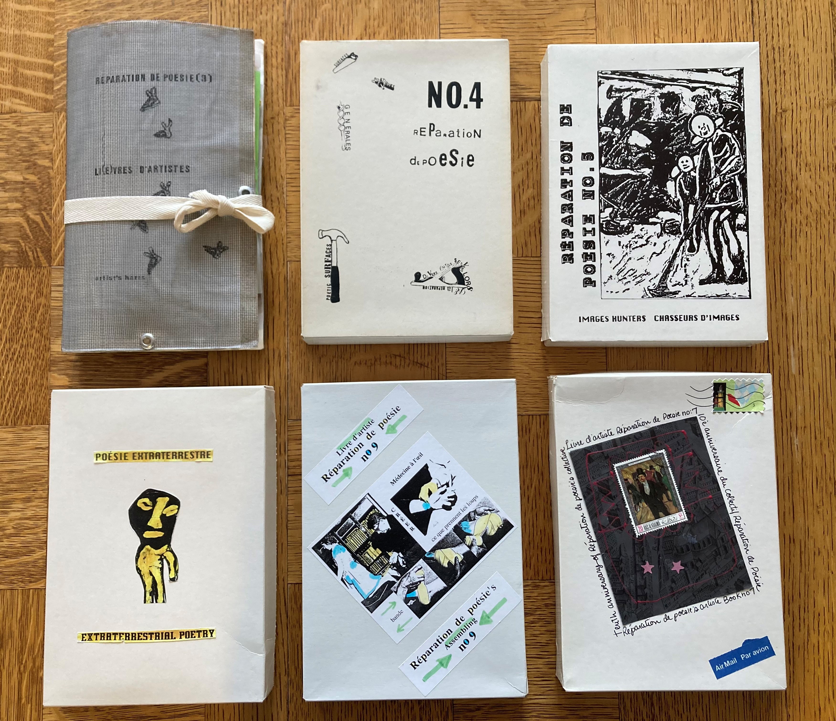 L’un des joueurs les plus importants en la matière au Québec est Réparation de poésie. Ce collectif fondé en 1985 par Jean-Claude Gagnon, l’« abominable homme des lettres »[note 3], a créé plus d’une vingtaine de publications artistiques avec la participation de créateurs provenant de partout dans le monde. Chacune de ces éditions se présente sous la forme d’une boîte, publiée en édition limitée, et rassemblant des œuvres originales de divers formats. BAnQ possède plusieurs de ces publications. Plonger dans ces boîtes aux trésors est véritablement une expérience hors du commun, qui nous permet d’explorer d’autres modes de lecture que celui associé au livre traditionnel.