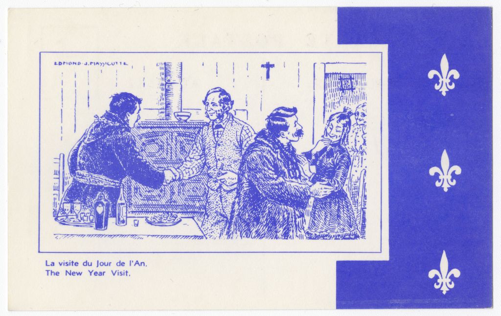 La visite du jour de l'An illustre bien la tradition des visites chez les amis et la parenté, lors desquelles on s’échangeait des vœux pour la nouvelle année. On en profitait pour faire un brin de jasette, savourer une ou deux bouchées et, avant de partir, vider un petit verre d’alcool pour « se remonter le Canadien ».