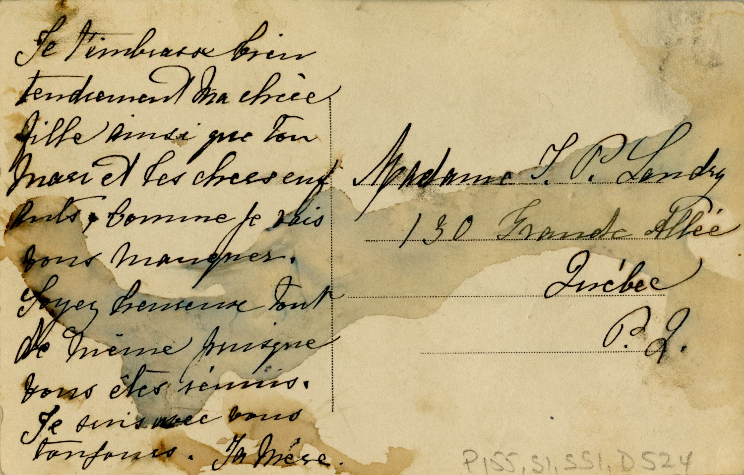 Côté verso, on peut déchiffrer le message de Marie-Louise Globensky-Lacoste, philanthrope, adressé à sa fille Blanche Lacoste-Landry et à sa famille pour le Nouvel An : « Je t’embrasse bien tendrement ma chère fille ainsi que ton mari et tes chers enfants. »