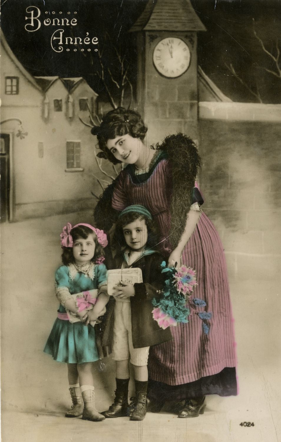 Remontant à 1900, cette carte postale de bonne année montre une femme avec une fillette et un garçonnet tenant des étrennes.