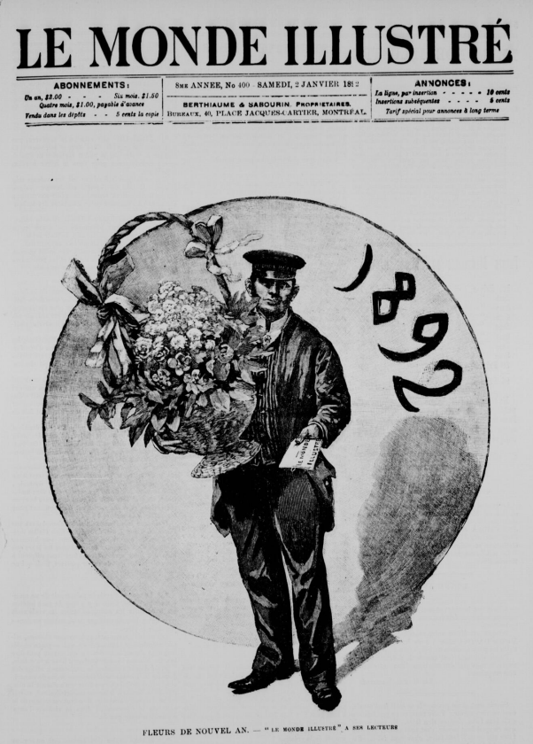 « À tous nos lecteurs et patrons que les présentes verront, salut et félicitations en la plus cordiale sympathie. Tel qu'il est dit en notre page de frontispice, Le Monde illustré offre à tous les siens ses souhaits les plus sincères de joie, santé et prospérité. Puisse mil huit cent quatre-vingt-douze ne ménager à tous que des émotions douces et d'agréables surprises! » (Le Monde illustré, 2 janvier 1892)