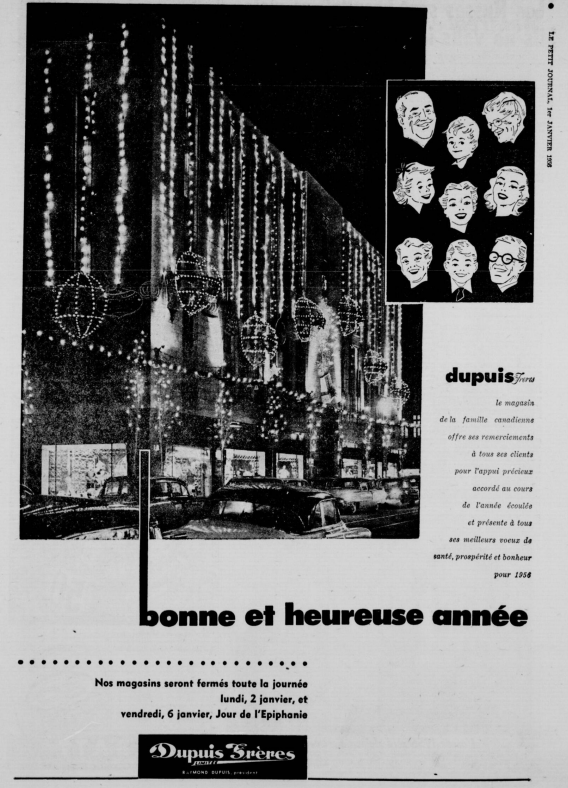Imprimée dans Le Petit Journal du 1er janvier 1956, cette page de souhaits s’accompagne de précisions sur les heures d’ouverture. Jadis l’un des grands magasins les plus en vue de Montréal, Dupuis Frères a eu, jusqu’en 1978, pignon là où se trouve aujourd’hui la Place Dupuis, au centre-ville de Montréal.