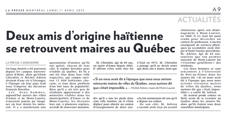 Ulrick Chérubin et Michel Adrien sont venus au Québec pour échapper au régime Duvalier, qui sévit en Haïti de 1957 à 1986. « Les deux hommes se sont rencontrés à l’Université de Port-au-Prince dans les années 1960. ‘‘Si on nous avait dit à l’époque que nous nous serions retrouvés maires de villes du Québec, nous aurions dit que c’était impossible’’, a confié M. Adrien. Ils avaient perdu contact en Haïti avant de se recroiser au Québec dans les années 1990, alors qu’ils étaient tous deux conseillers municipaux (La Presse, 1er avril 2013). »