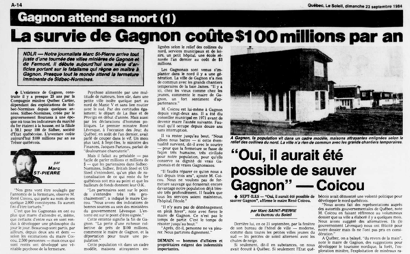 Frappé par la tragédie, il perd son épouse et doit s’occuper de ses enfants… avec le soutien de ses concitoyens (source 1). Malgré l’adversité, il s’implique dans diverses associations locales et, sur le conseil d’amis, se tourne vers la politique. En qualité de maire, il effectuera trois mandats, de 1973 jusqu’aux derniers jours de Gagnon en 1985 – la ville sera carrément rasée…