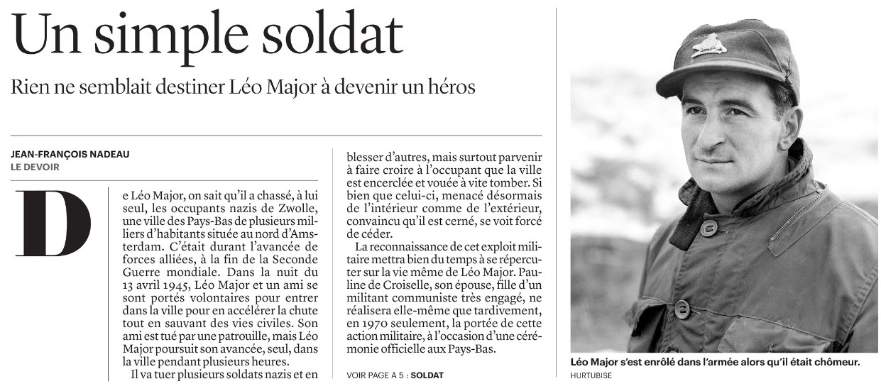Parmi eux, Léo Major, qui s’est enrôlé en 1940 et qui combattra également pendant la guerre de Corée, est un héros peu connu. Luc Lépine, auteur d’une biographie de Major publiée en 2019, en parle avec Jacques Beauchamp dans un épisode du balado Aujourd’hui l’histoire, sur Radio-Canada Ohdio.