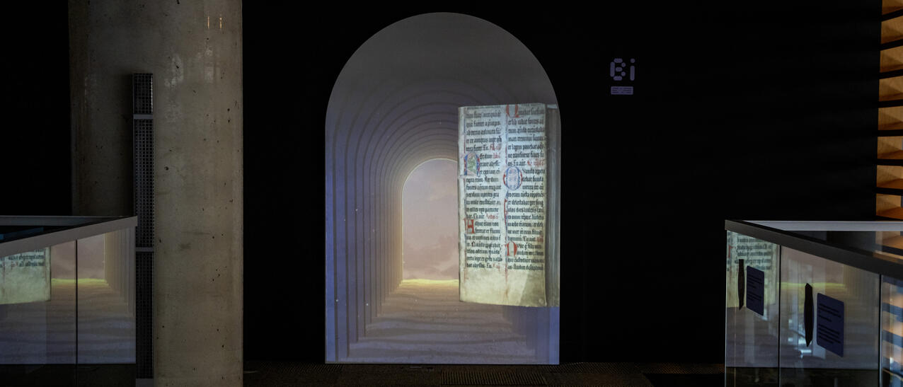 Alors que vous marchez sur la passerelle, le portail lumineux du Biblioscope dévoile des reliures anciennes soigneusement conservées par BAnQ. Admirez ces trésors venus d’un autre temps.